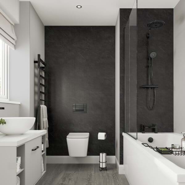 Dieses Wandpaneel mit seiner Reliefstruktur besitzt eine matte Oberfläche, die es wie echte Schieferplatten aussehen lässt. Mit unseren River Slate-Paneelen können Sie Ihrem neuen Badezimmer einen tiefgründigen, geheimnisvollen Look verleihen.