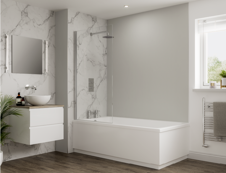 Bei der Verbauung mehrerer Paneelen stellt unser präzises Hydrolock-Verbindungssystem mit seinen Nut- und Federkanten, die eine einfache Klickmontage gewährleisten, eine nahezu nahtlose und absolut wasserdichte Verbindung zwischen den einzelnen Paneelen her. Damit haben Sie die Möglichkeit, eine fugenlose Wandpaneelfläche in Marmoroptik zu gestalten, die Ihr Badezimmer in jedem Fall heller und größer wirken lässt.