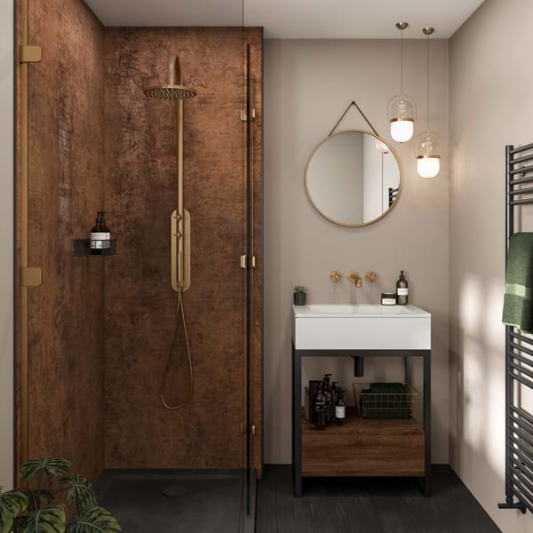 Patina Bronze – Ein ganz besonderes, sehr warmes Paneel, das dank seiner intensiven Färbung und der realistisch wirkenden Maserung an echte Bronzeplatten erinnert. Ein absolutes Schmuckstück, das auch aus Ihrem Badezimmer einen luxuriös-eleganten Raum formen wird.