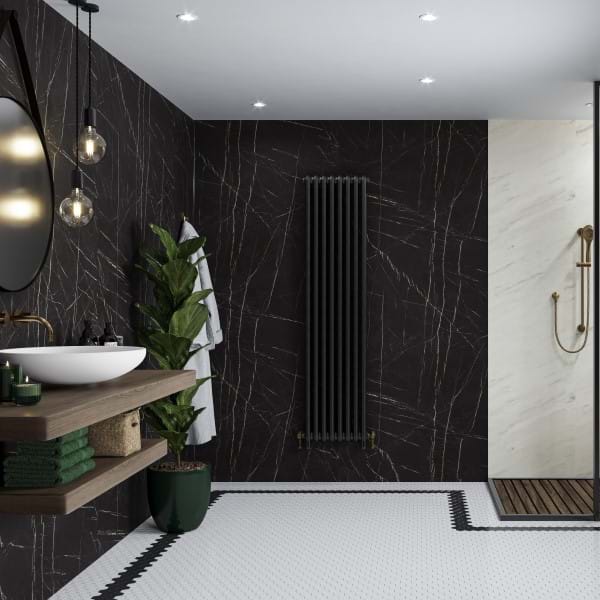 Marmor muss nicht weiß sein. Black Pietra ist ein schwarzes Marmorpaneel mit feinen weißen Adern. Das Paneel sieht sowohl alleine als auch in Kombination mit Levanto Marble aus der Exklusiven Premium-Kollektion atemberaubend aus. Verleihen Sie Ihrem Badezimmer das gewisse Etwas!