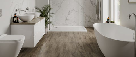 Unsere Badezimmer-Bodenbeläge – das sind luxuriöse Vinylböden in Fliesen-, Stein- oder Holzoptik, die Ihrem Badezimmer den Look-and-Feel echter Naturstein- oder Holzböden verleihen, dabei aber wesentlich pflegeleichter, wärmer und auch rutschfester sind als ihre Echtmaterial-Varianten. Zudem sind unsere Vinyl-Bodenbeläge wesentlich einfacher und schneller zu verlegen als herkömmliche Steinplatten oder Holzplanken, da sie fugenlos verbaut werden und sich dank unseres praktischen Klick-Systems einfach zusammenstecken lassen.